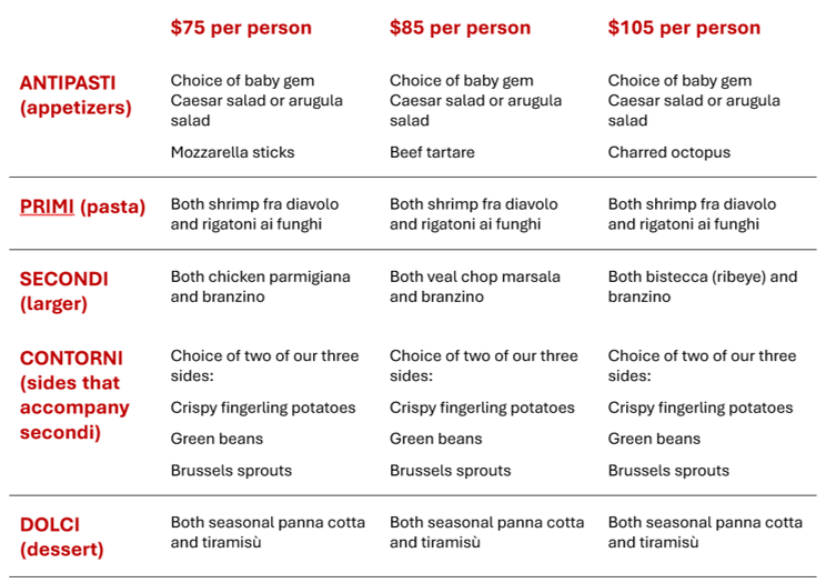Groups are always served family style with shared dishes. Our group menus can be customized. Below are three starting-point menus. We are happy to work with you to build a menu that your group will love. We accommodate dietary restrictions with individual plates of appropriate food at no additional cost.